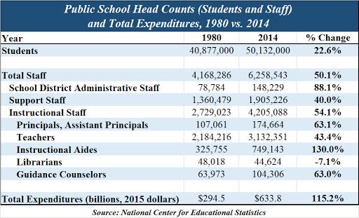 Процент учащихся (от населения) упал больше, чем на 10%, при этом хотя и число их стало больше, рост числа бюрократов гораздо выше. Ну и расходы, конечно, которые с учетом инфляции упали где-то на треть. Такая вот "статистика" от ".. Center for .. Statistics".