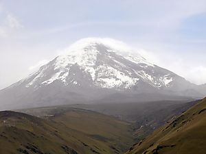 Из Баньоса в Монтаниту поехали по дороге через Амбато на Гуаранду. Километров 50 этой дороги идет очень высоко в горах по довольно унылой на вид местности, почти лишенной растительности. Апач описал ее как "очень красивое и очень страшное место". Трасса, слава богу, вполне качественная. По мере продвижения слева показалась затянутая тучами заснеженная вершина какого-то неактивного вулкана (все высокие горы тут - бывшие или действующие вулканы): Судя по карте, это вулкан Чимборасо (Chimboraso), высота которого около 6300 метров (разные источники не сходятся между собой, но по любому там не меньше 6250м) над уровнем моря. Это означает, что дорога проходит на высоте около 5000м, так что понятно почему Апач с Ксюрой жаловались на недостаток воздуха. Дорога огибает его справа практически по полукругу, так что вулкан постепенно представал нам с разных сторон, сверкая снегом с северного склона: Постепенно он остался сзади: И мы начали долгий спуск в более приветливо выглядящие места: Спуск, кстати, оказался более стремным, чем участок возле Чимборасо - постоянно встречались нарисованные на дороге голубые сердца - так тут отмечают места, где кто-то разбился насмерть. Ей богу, так много и так плотно я их никогда не видел, при том, что покрытие там, в общем-то, вполне сносное. В заключение - отличную панораму высокогорья с вулканом вы можете увидеть у Апача.